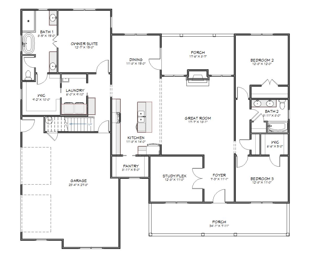 This thoughtfully designed home features an open-concept layout with a spacious great room flowing into the kitchen, dining area, and large covered porch for easy indoor-outdoor living. The private owner’s suite includes a walk-in closet and luxury bath, while two additional bedrooms share a hall bath. A study/flex room, laundry, pantry, and two-car garage add convenience. An optional upstairs loft with storage provides flexible expansion space.