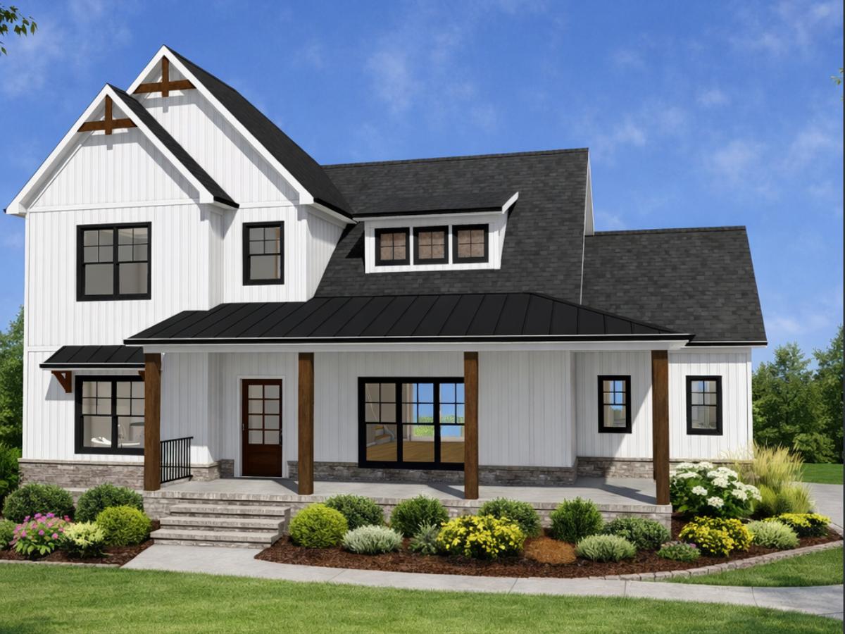 This farmhouse-style home features a welcoming wraparound porch and open-concept living spaces connecting the great room, dining area, and kitchen with island. The main level includes a private owner’s suite with walk-in closet and spacious bath, plus pantry and laundry. Upstairs offers three additional bedrooms, a shared bath, linen and storage closets, creating a practical layout ideal for family living and entertaining.