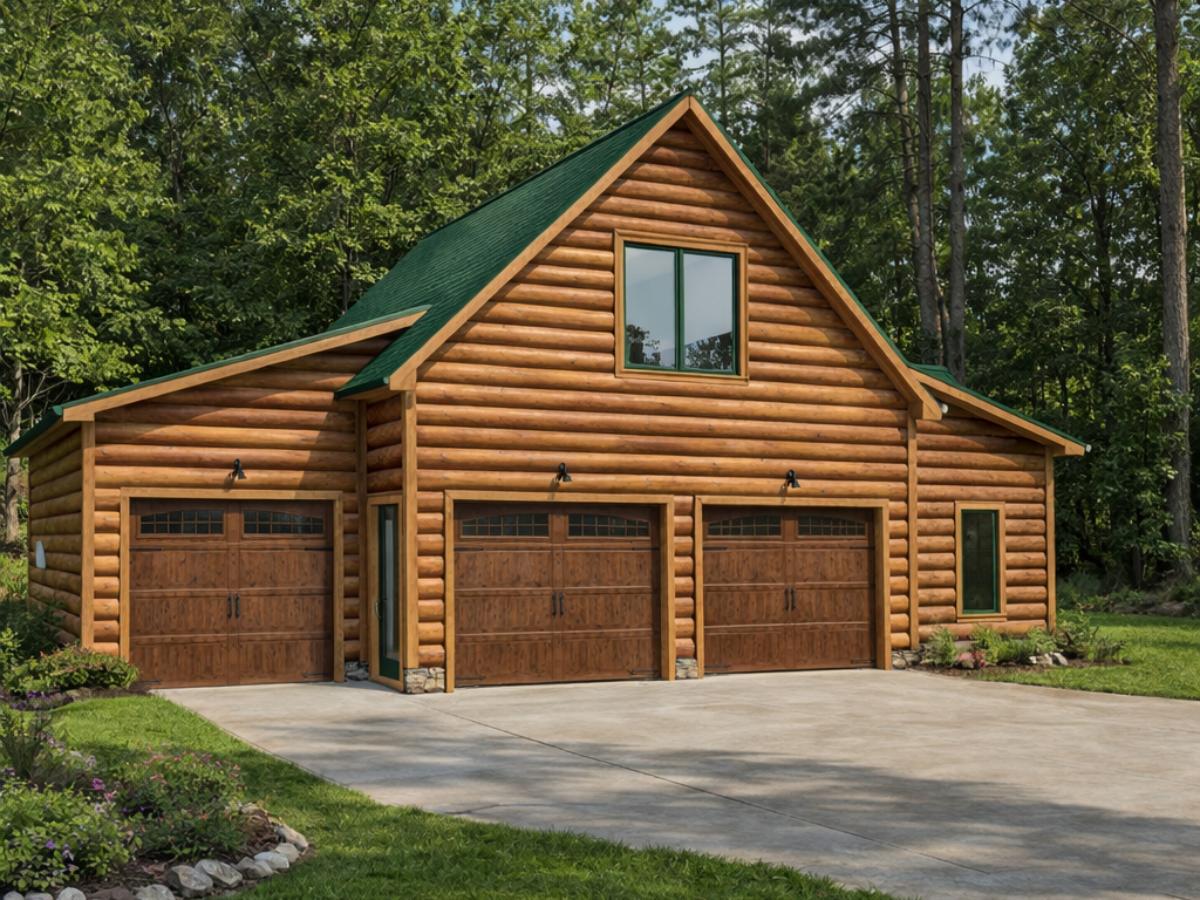 This detached vintage garage features three bays with a spacious central area and an additional side bay. Inside, two private offices, a restroom, and a covered porch provide functional workspace. A staircase leads to a large loft above, ideal for storage or expansion. The rustic exterior pairs timber siding with a gabled roof, blending practical utility with cabin-inspired design.