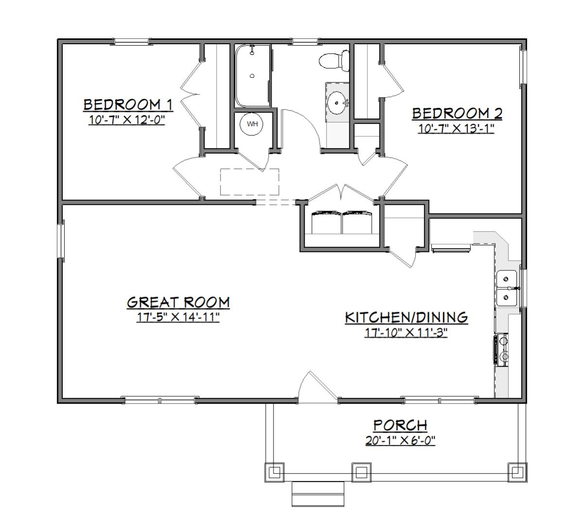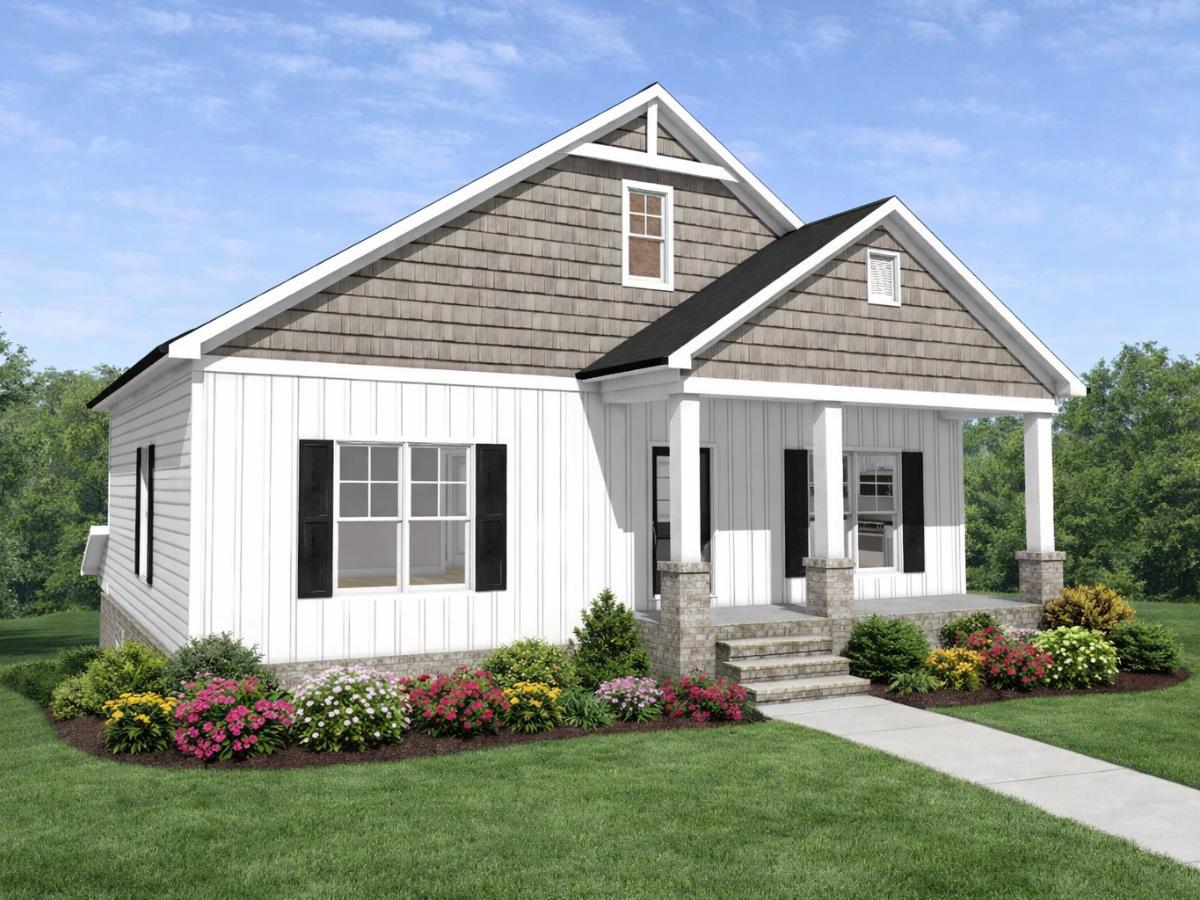 This compact two-bedroom home features an open great room flowing into a kitchen/dining area, a central bath, and a welcoming front porch. Its efficient layout maximizes space and comfort, making it ideal for a small family or an attractive, low-maintenance rental property.