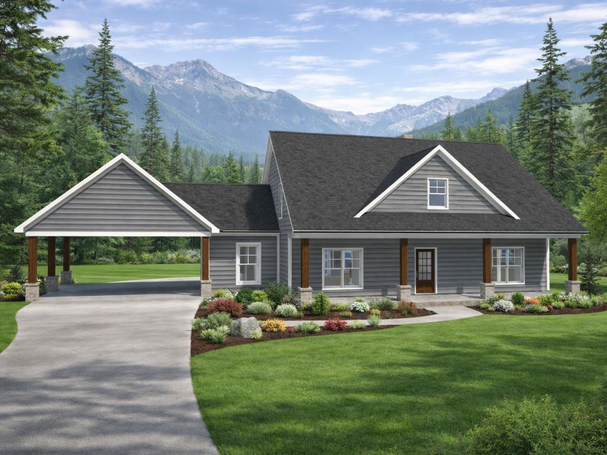 Charming craftsman-style home featuring a spacious great room, and open kitchen with island and pantry. The main-level owner’s suite offers privacy and a luxurious bath, while a mudroom, laundry, and carport add convenience. Upstairs includes a versatile loft and two additional bedrooms. Thoughtfully designed for comfortable living with functional flow and timeless curb appeal.The welcoming front porch and attached carport (optional garage) add charm and practicality, all wrapped in a classic exterior suited for scenic surroundings.