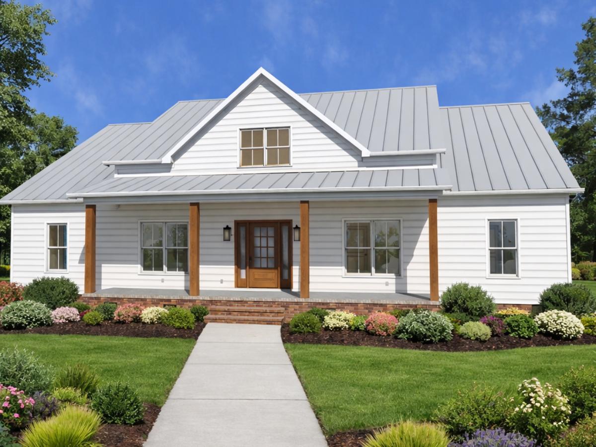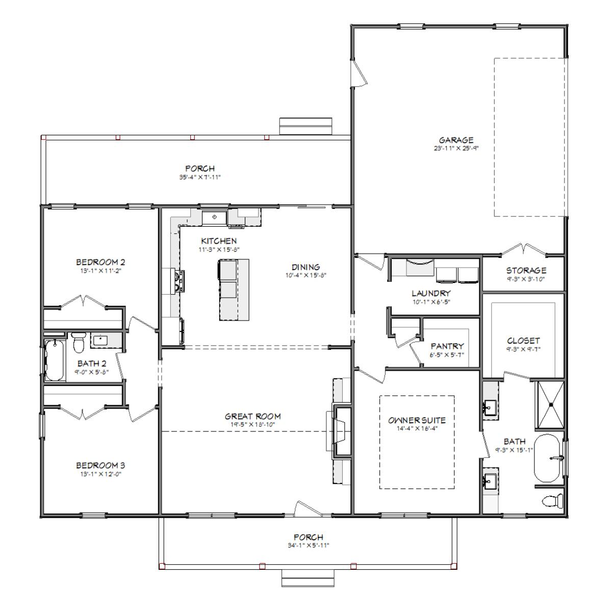 This simplistic farmhouse design features an open-concept great room, dining area, and spacious kitchen with island, ideal for everyday living and entertaining. The private owner’s suite includes a large bath and walk-in closet, while two additional bedrooms share a convenient hall bath. A generous front porch enhances curb appeal and outdoor living, while a mudroom with laundry, pantry, storage, and an attached two-car garage adds everyday functionality.