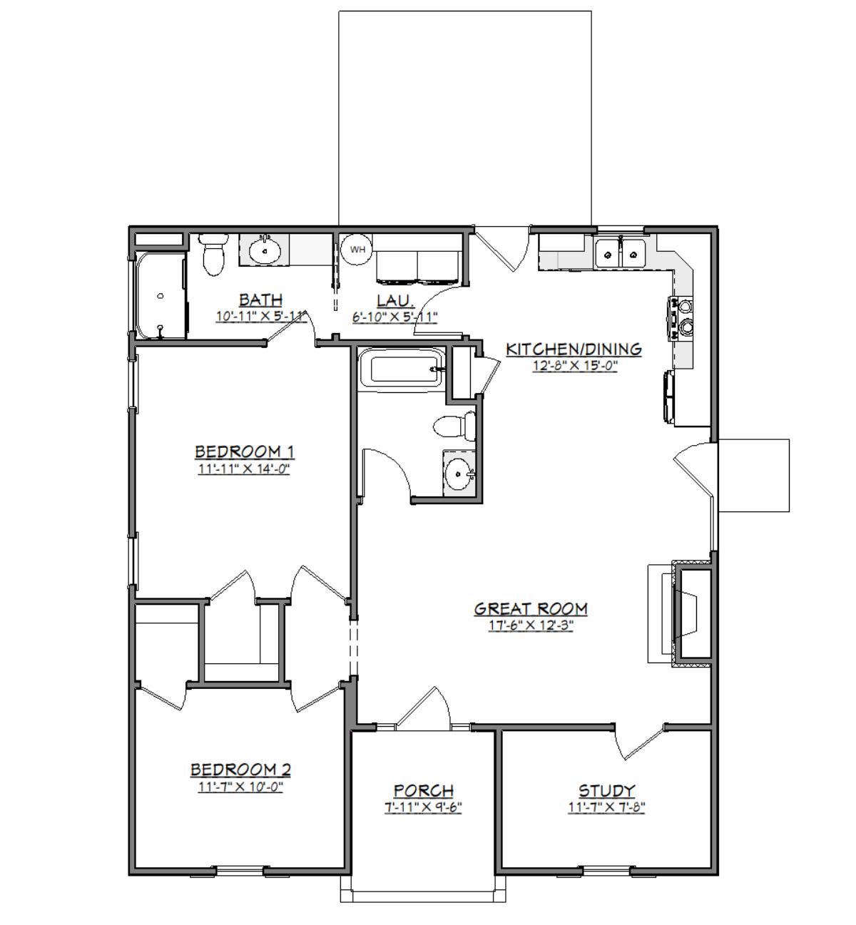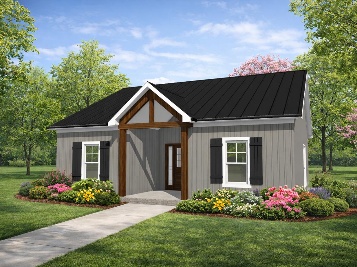 This thoughtfully designed cottage offers efficient, affordable living without sacrificing style. The open great room flows into a bright kitchen and dining area, while two bedrooms and a flexible study provide comfort and versatility. A welcoming front porch and clean, modern exterior with warm wood accents create strong curb appeal—making it an ideal, budget-friendly option for new construction or first-time homeowners.